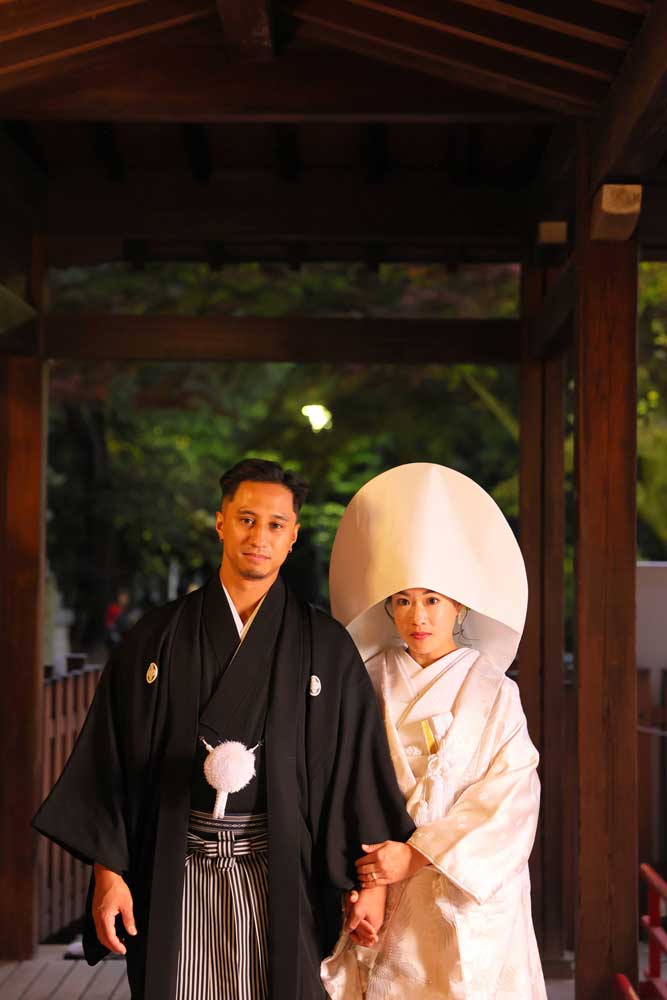 そして迎えた撮影当日。神社に差し込む光の中で、おふたりが並んで歩まれる姿はとても清らかで、国や文化の違いを越えた「家族の絆」の温かさがそのまま形になっているようでした。日本らしい静謐な空気と、アメリカで育まれた明るく自由な雰囲気が自然に溶け合い、スタッフも胸が熱くなる瞬間が幾度となくありました。